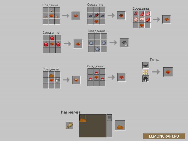 Мод на новые супы Soups даст вам возможность насладится вкусом 6 видов новых супов, которые добавляет мод. Супы можно сварить из коричневых грибов, из мухоморов, из яблок. Так же вы сможете отведать хлопья с молоком и суп из морепродуктов.